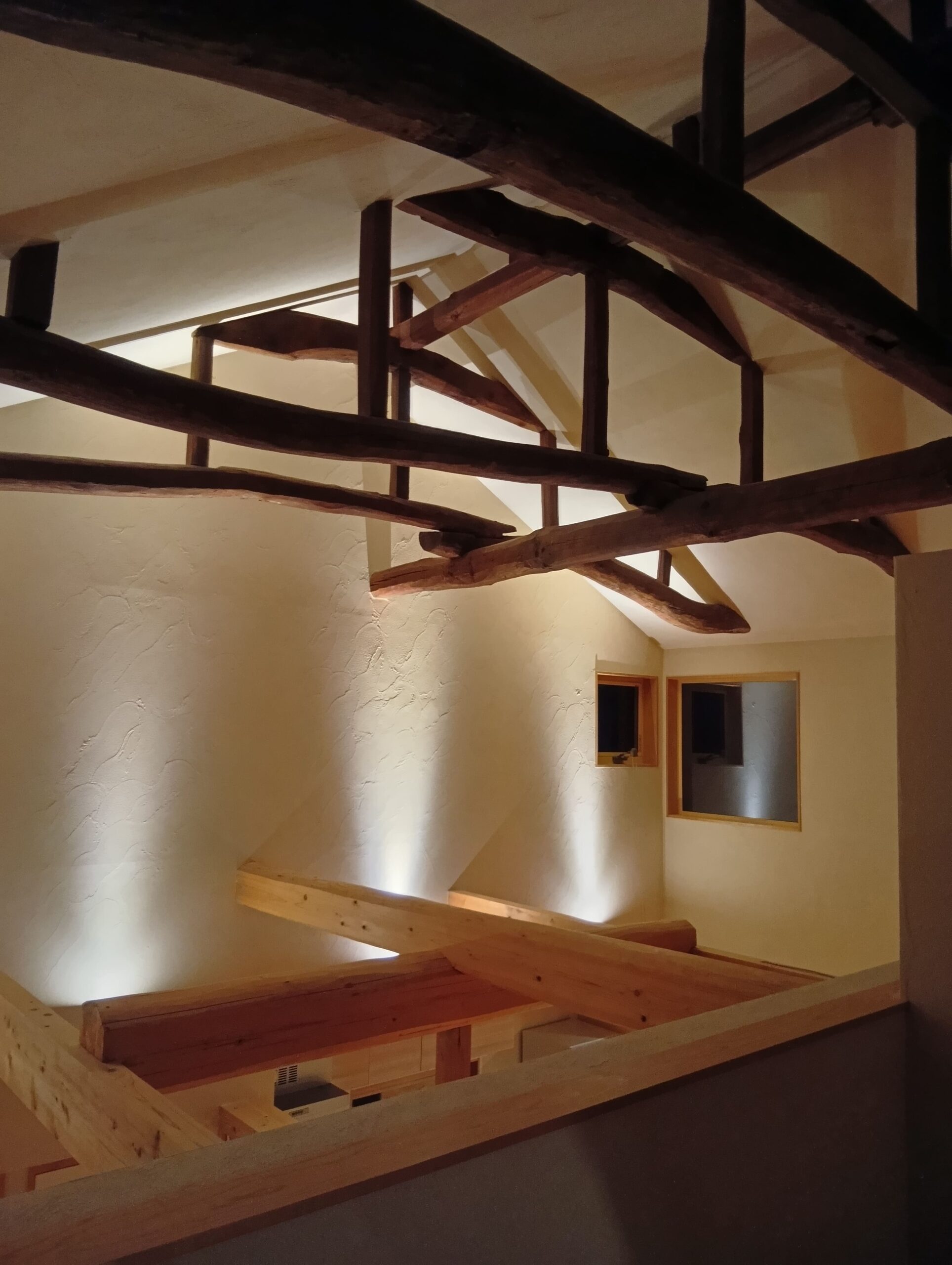 スポットライトが築100年の梁を柔らかく照らし、その陰影が空間に奥行きをつくる。吹き抜けの”高さ”を見せていたのは、天井そのものではなく、光だったのです。