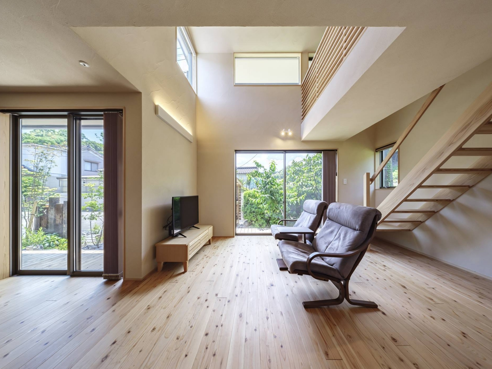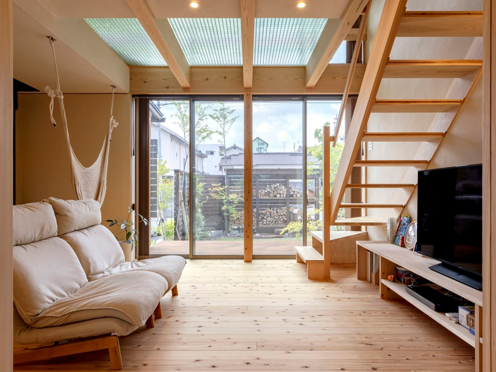 南北に細長い敷地を巧みに利用し、玄関から庭先までまっすぐに視線が抜けるよう計算された設計は、訪れる人々をも都会の喧騒の中にひっそりと佇む緑のオアシスへと誘います。