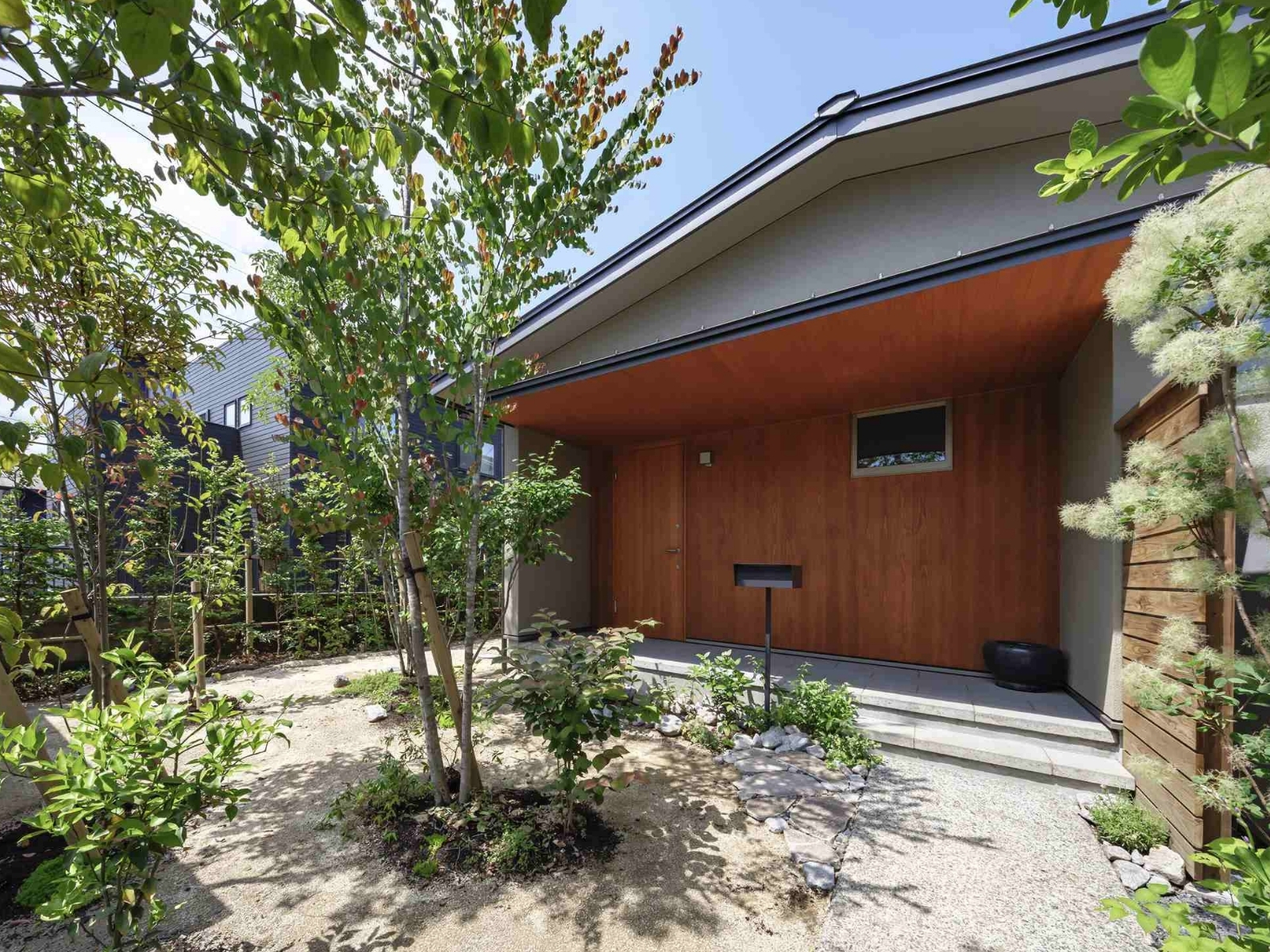 自転車置き場を兼ねた広々とした玄関ポーチ、正面には杉板張りなど、意図的に自然素材を取り入れることで周囲との調和性と視覚的な美観を高めました。
