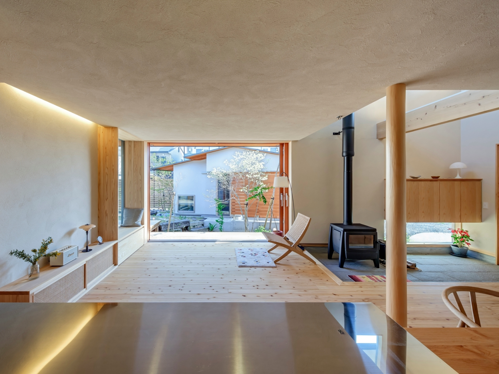 ペレットストーブが鎮座する土間スペースでは家族や友人と過ごす特別な時間を演出してくれます。
