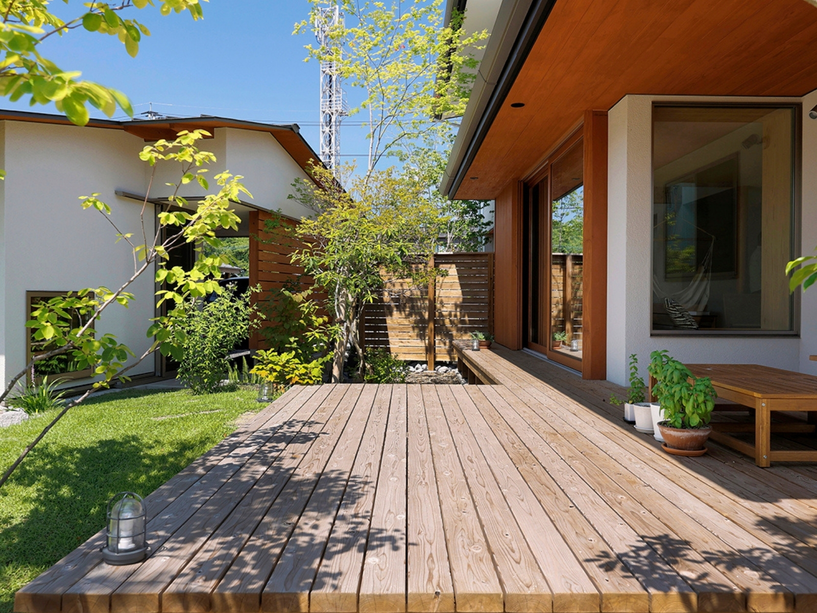 屋根付きのウッドデッキは、天候に左右されずにアウトドアを満喫するためのスペース。