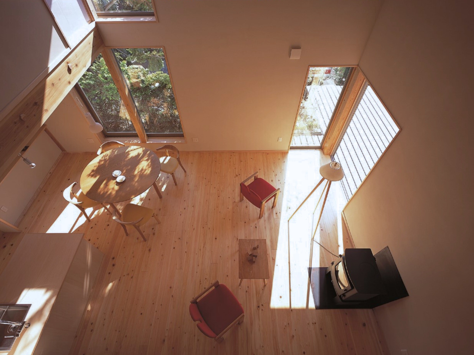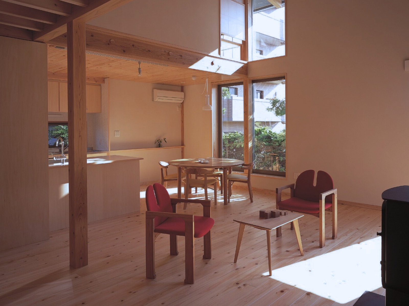 家の中心にあって人と人との絆をあらわすリビングは、時間帯によって、光と影が交互に入り込み、一日の時の流れを感じられる空間となっています。