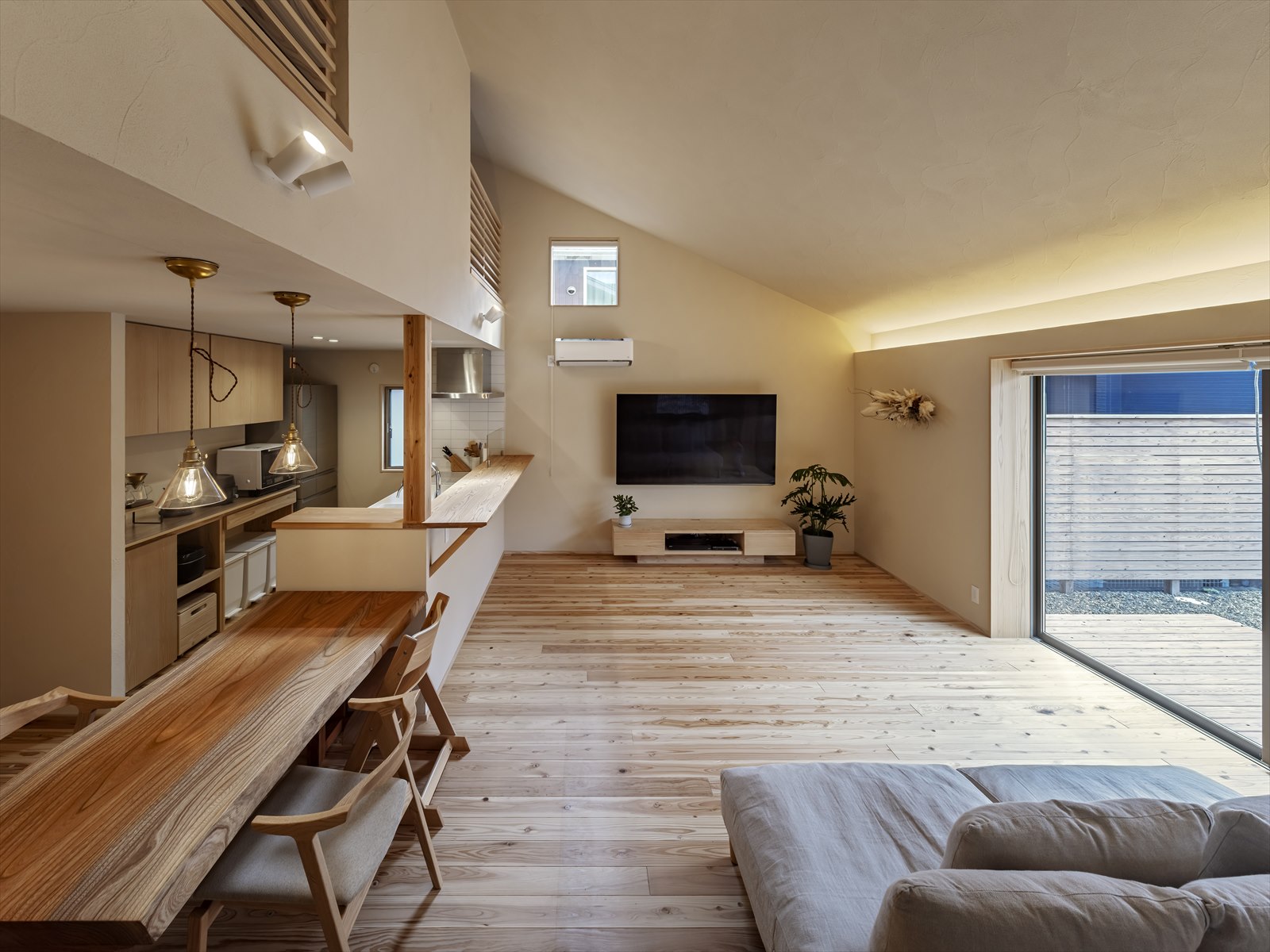 耐震・断熱という確かな性能と、杉や珪藻土の柔らかな風合い。その両方を叶えた、大屋根と勾配天井の住まいです。機能美と心地よさが高度に調和した空間を、ぜひご体感にいらしてください。