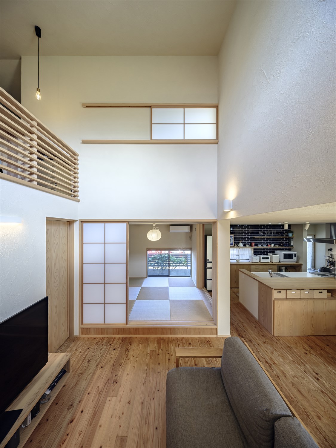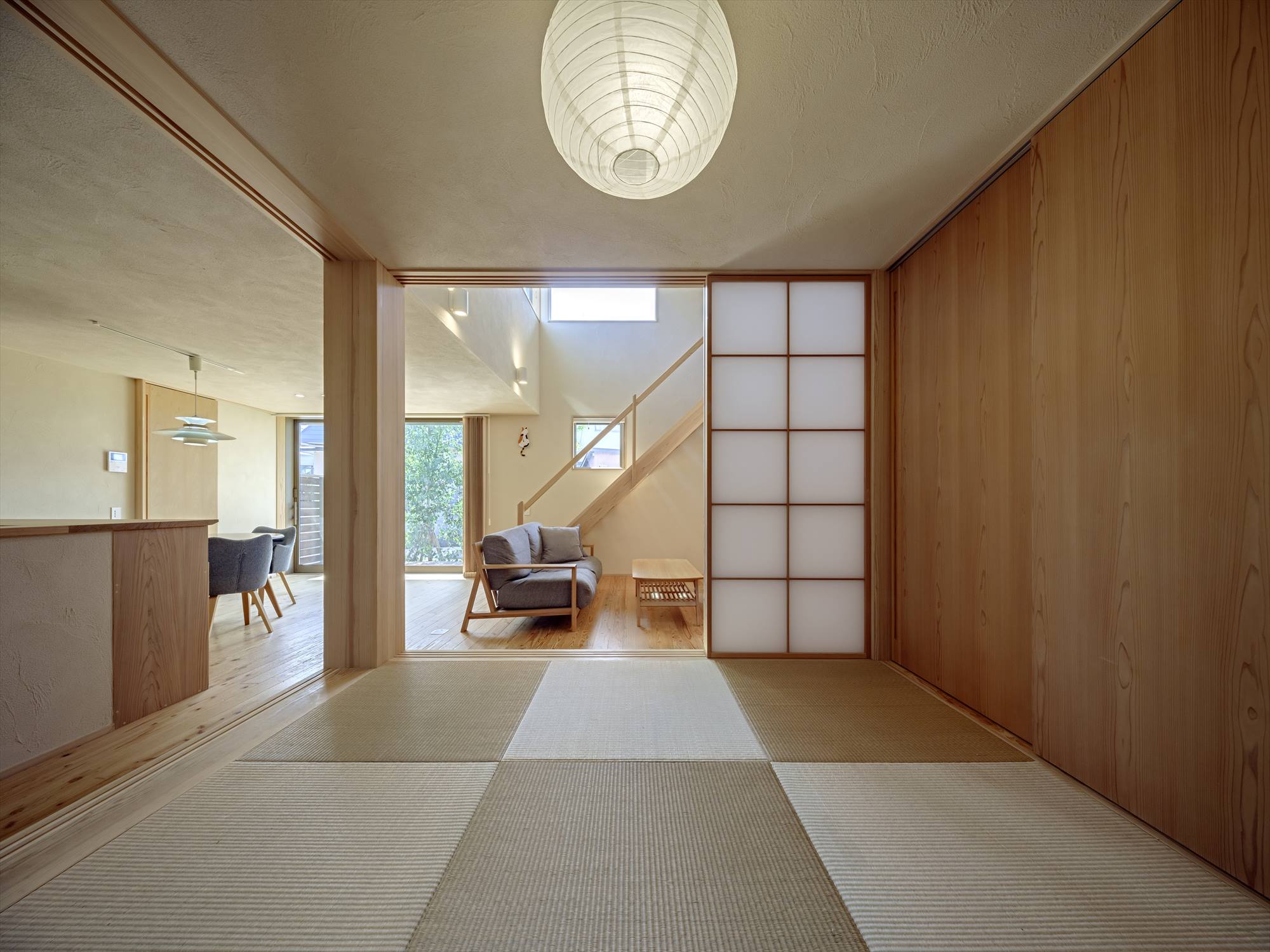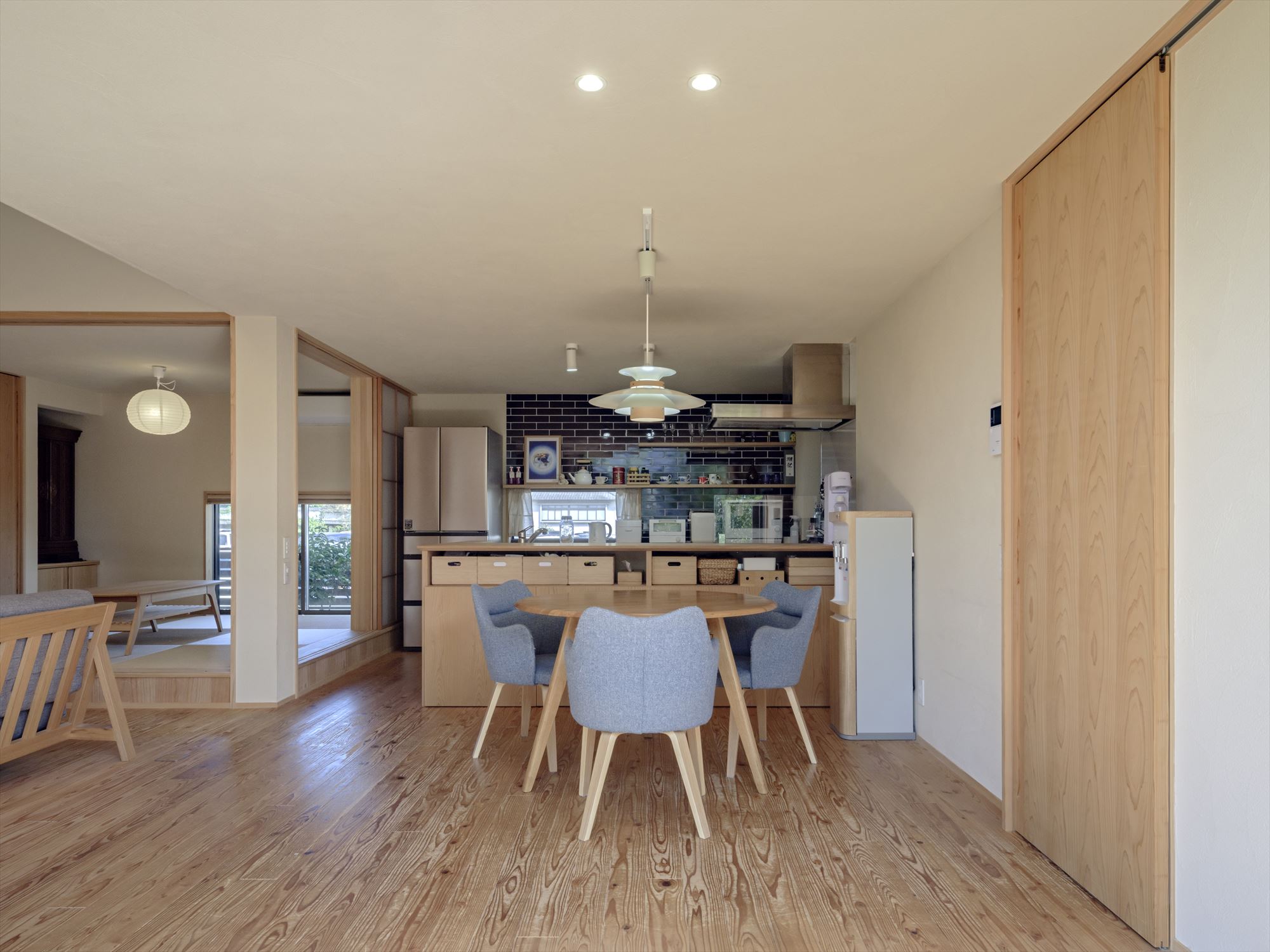 LDKには引き込みの大開口を設け、室内からウッドデッキとお庭まで視線が伸び、お庭までも暮らしの中に取り込みます。また、リビングに小上がりの畳スペースを併設して、日常は腰かけてご家族が集まるリビングとして、来客時には隠れていた障子戸を閉めて宿泊スペースとして、活用できます。