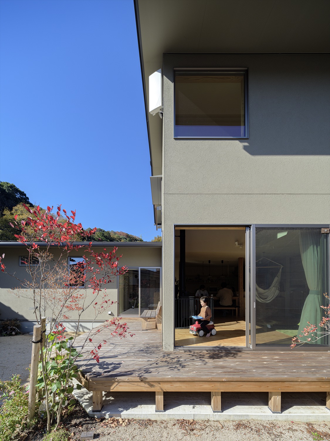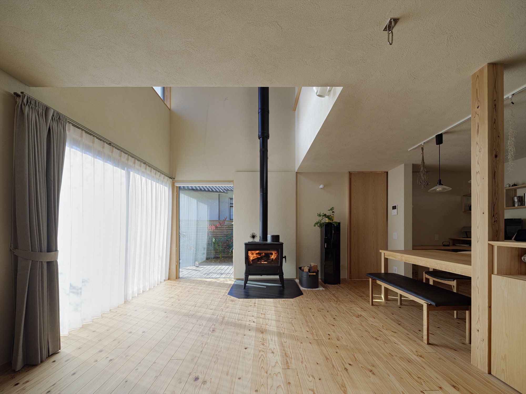 夏はハンモックに揺られながら日向ぼっこを愉しみ、冬にはシンボリックに配置された薪ストーブが暮らしに温かさと豊かさを与えてくれます。