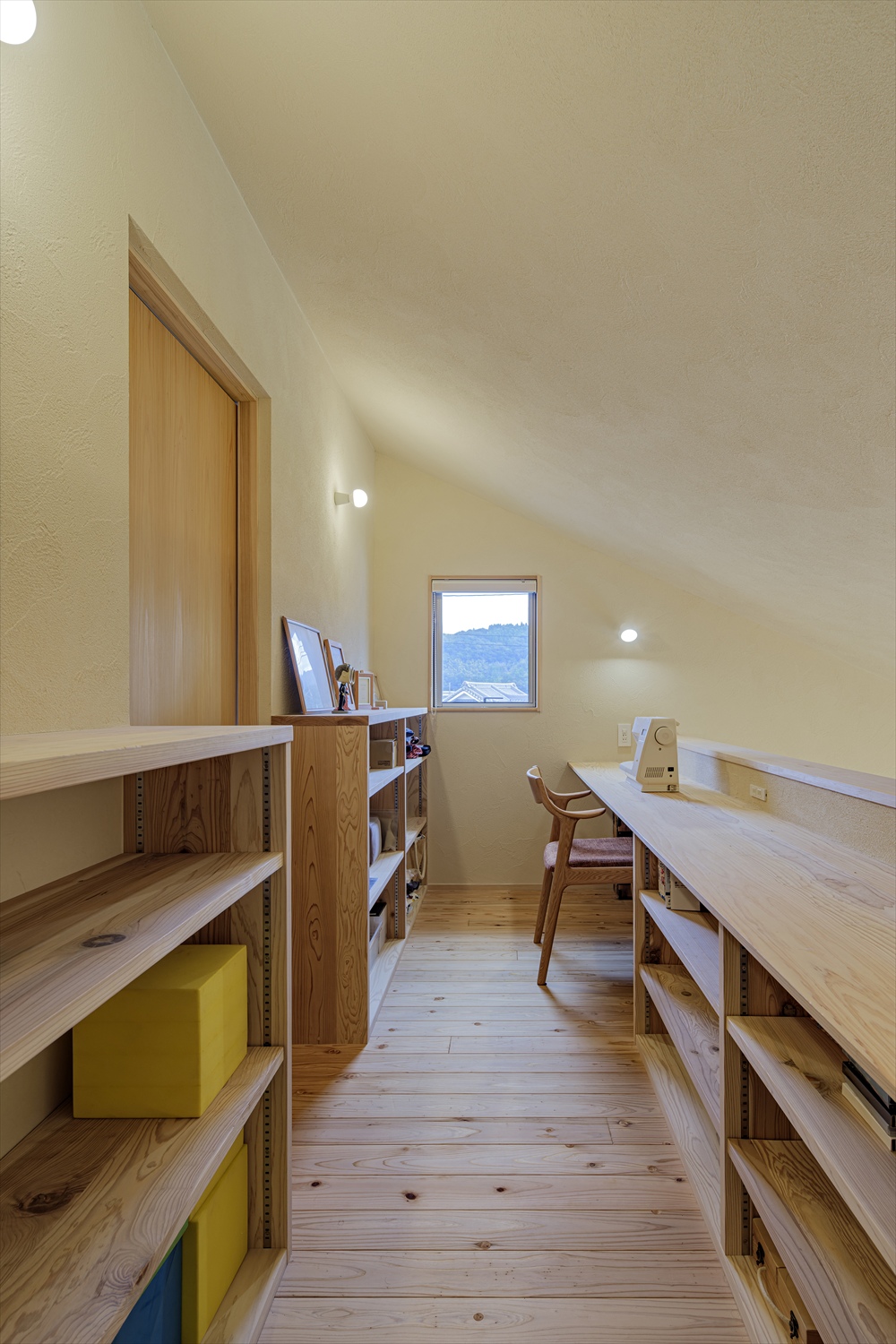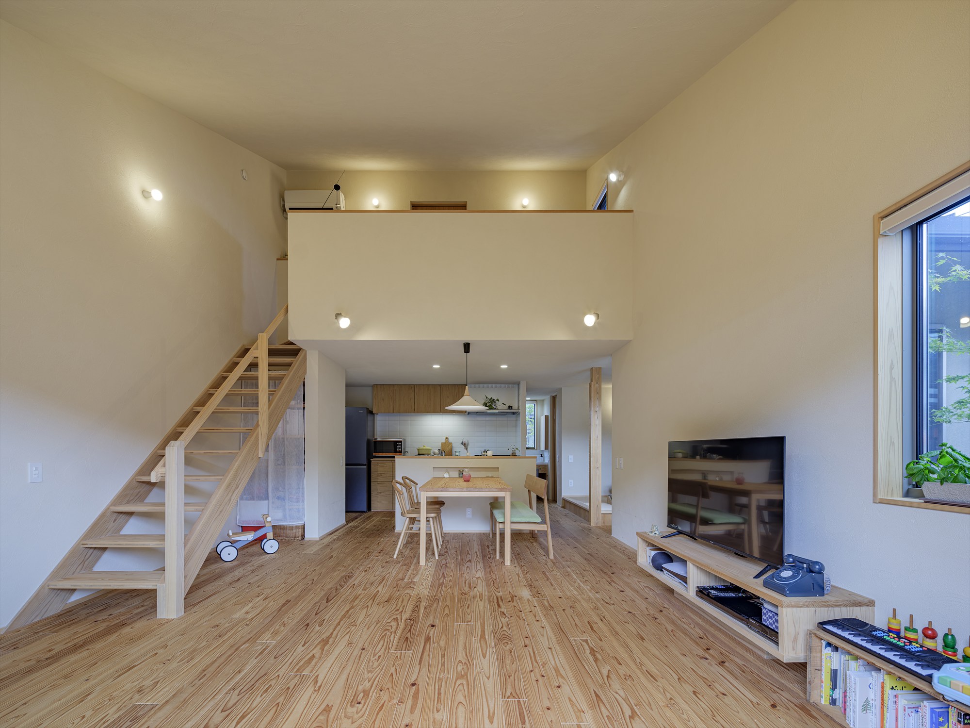 将来的には全ての生活が平屋部分で完結するように、総二階建てではなく一部にのみ二階を設け、キッチンや浴室、寝室などの生活に必要な要素すべてを一階部分に配置した設計。