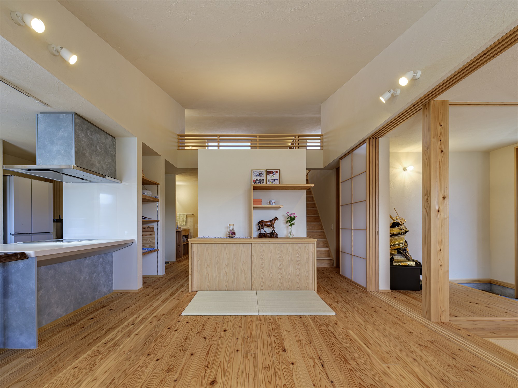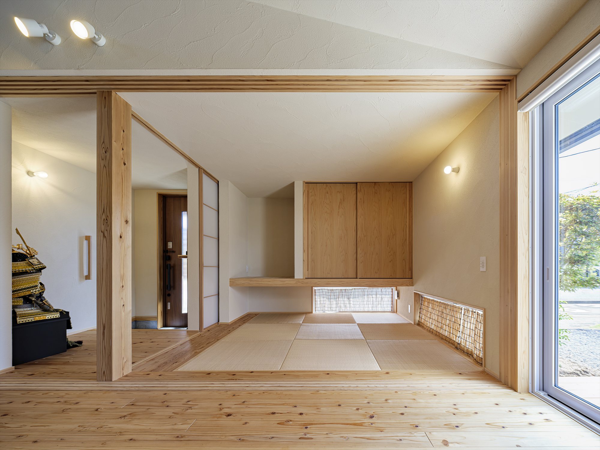 玄関から直接アクセスできる七島藺の客間にはリビングとの間に4枚の引込み障子の設けることで、普段の生活ではリビングとひと繋がりに使えたり来客の際は障子すべて閉めたりと、開放感とプライバシーの確保を両立しています。