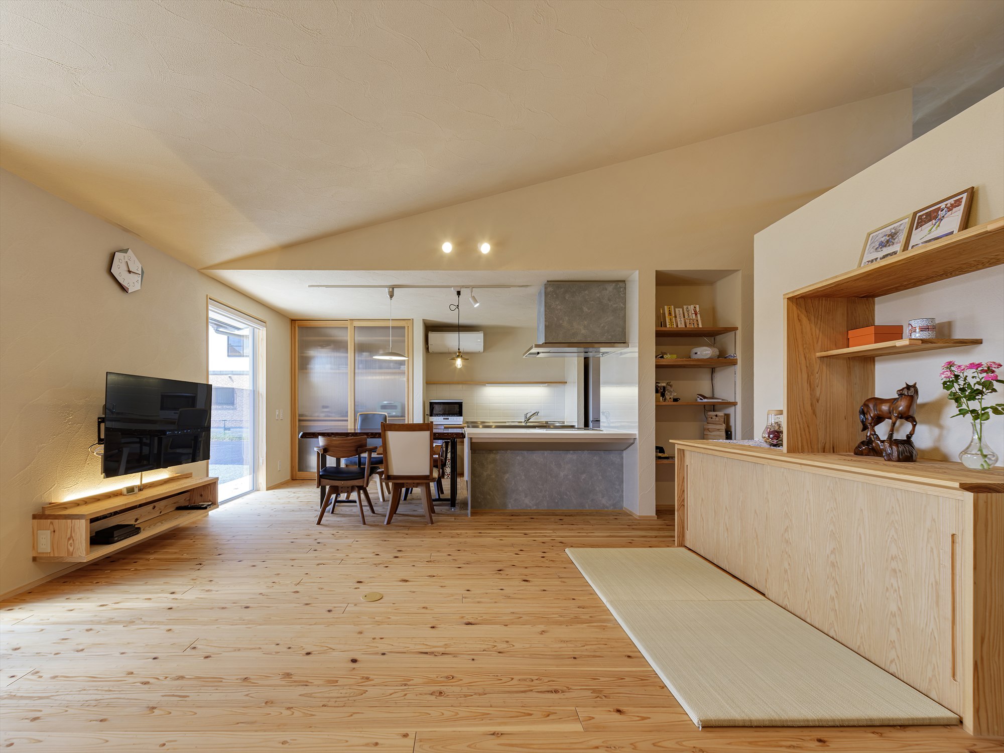 キッチンの床をリビングより下げることで、アイランドキッチンとダイニングテーブルの高さを合わせ一続きに利用できます。